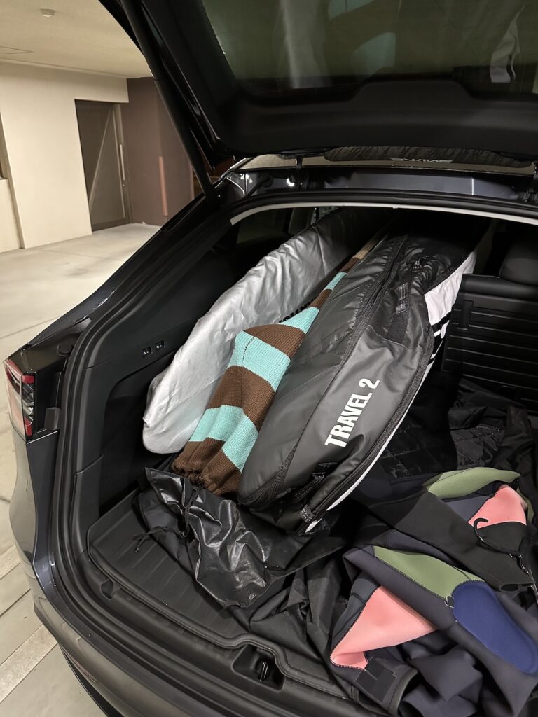 GWの休暇を活用し、4人5本のサーフボードと荷物をモデルYに積んで、3泊のサーフトリップを敢行!